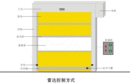 (一) 雷达加按钮感应式快软门,因雷达感应能感应所有的移动物体,不管是车辆还是人员,只要到了雷达的感应区域(感应区域可调),门就会自动开启;当车辆和人员离开感应区后,门会在设定的时间内自动关闭(延时时间可调)。优点:安装此类开启方式的门,进出方便、可以提高工作效率。(配双侧雷达和双侧手动按钮)