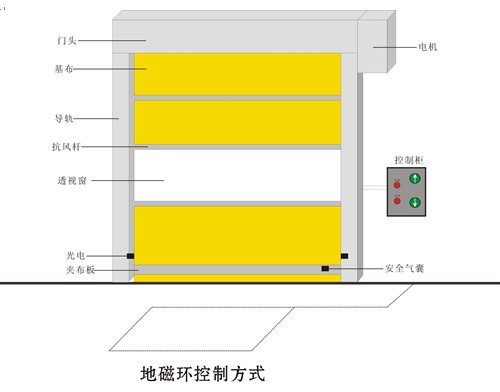 (二) 地磁加按钮感应式快软门,因地磁感应能感应车辆及金属物体,当车辆及金属物体到了地磁的感应区域(感应区域可按客户要求安装),门就会自动开启;当车辆及金属物体离开感应区后,门会在设定的时间内自动关闭(延时时间可调)。优点:安装此类开启方式的门,车辆进出方便、可以提高工作效率,减少不必要的开启次数。