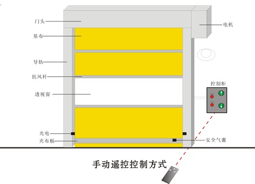 (三) 遥控加按钮式快软门,因遥控器可以随身配带在叉车司机身上或车辆的方向盘上,可在40-50米的有效感应区内操作,门就会自动开启(可以设定一个遥控开关只能开启一套门,同时可以设定一个遥控开关可以开启多套门);当车辆和人员通过门洞后,门会在设定的时间内自动关闭(延时时间可调)。优点:安装此类开启方式的门,车辆进出方便,没有遥控器的人员不能进出此门。(配遥控器和双侧手动按钮)
