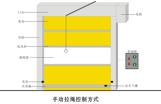 (四) 拉绳加按钮式快软门,拉绳拉杆可根据现场需求确定远近距离,司机可以在车辆上(或进出人员)轻轻拉动拉绳,门就会自动开启;当车辆和人员通过门洞后,门会在设定的时间内自动关闭(延时时间可调)。特点:因不同的现场,有不同的局限性;在不能安装其他感应方式时可选择此类开启方式的门,操作方便。(配双侧拉绳和双侧手动按钮)
